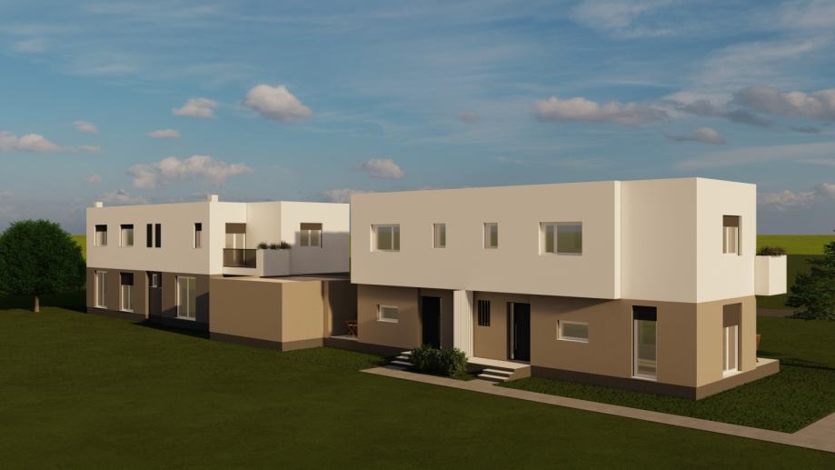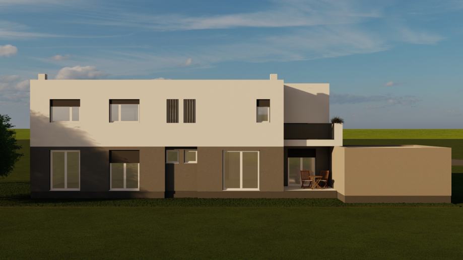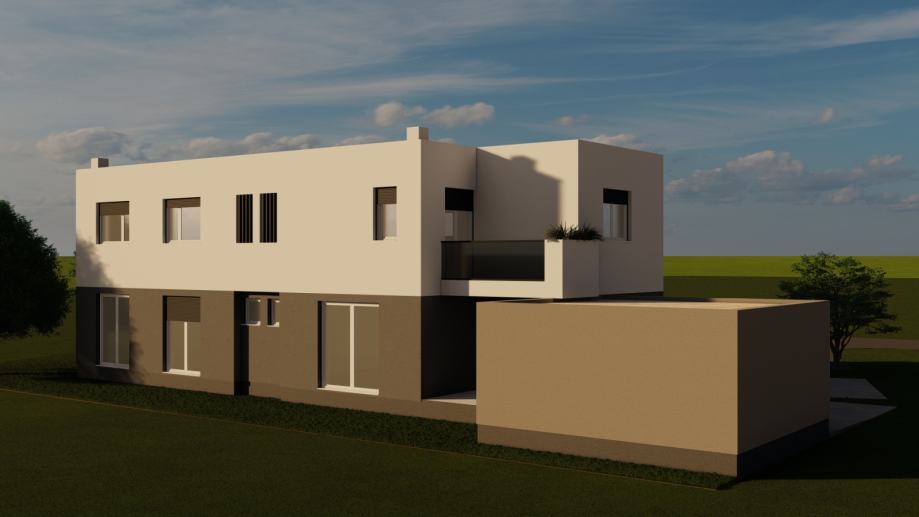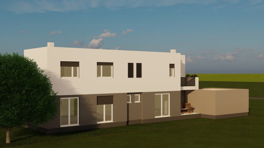 Stambena građevina koncipirana je kao dva odvojena stana, projektirana prema modernom arhitektonskom rješenju sa ravnim neprohodnim krovom, toplinske izolacije energetskog razreda A (grafitni stiropor kao izbor kod izolacije pasivnih i niskoenergetskih kuća) , međukatne konstrukcije od armiranobetonske ploče debljine 20cm i pvc stolarijom iznimne kvalitete.
